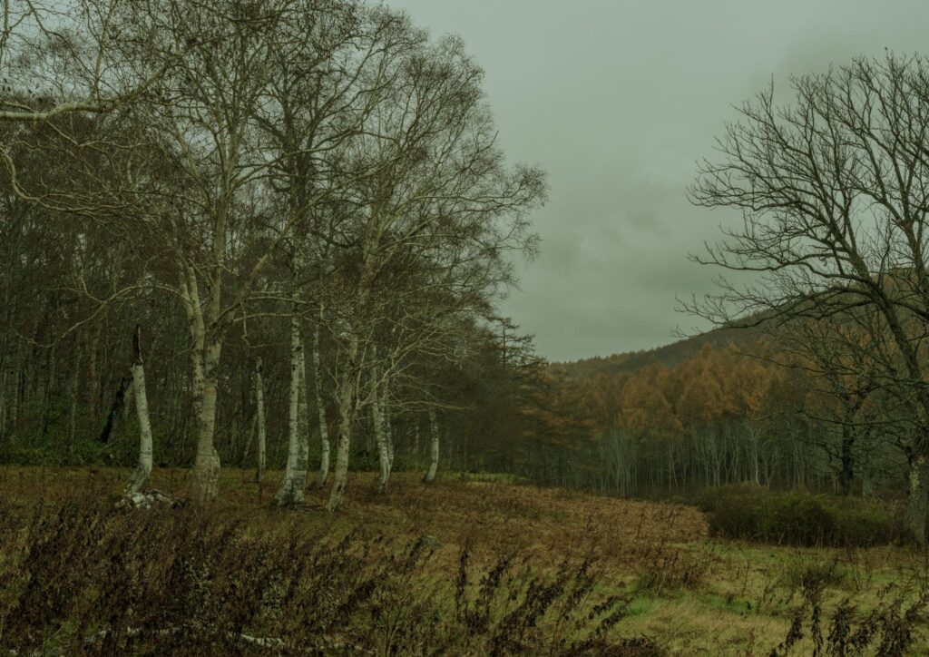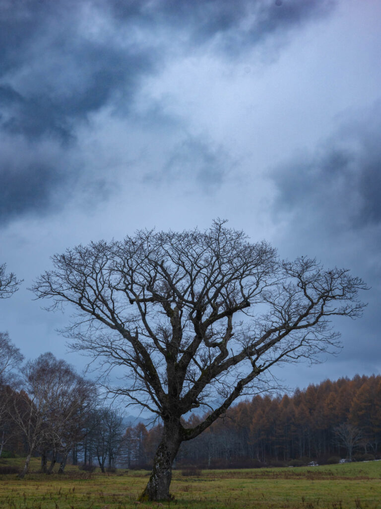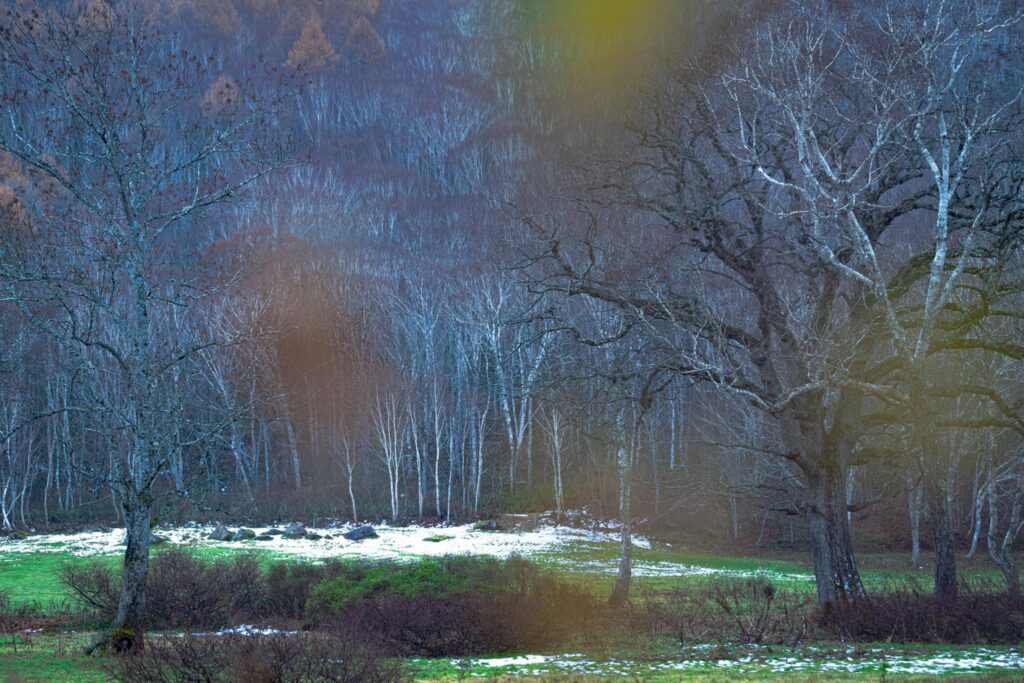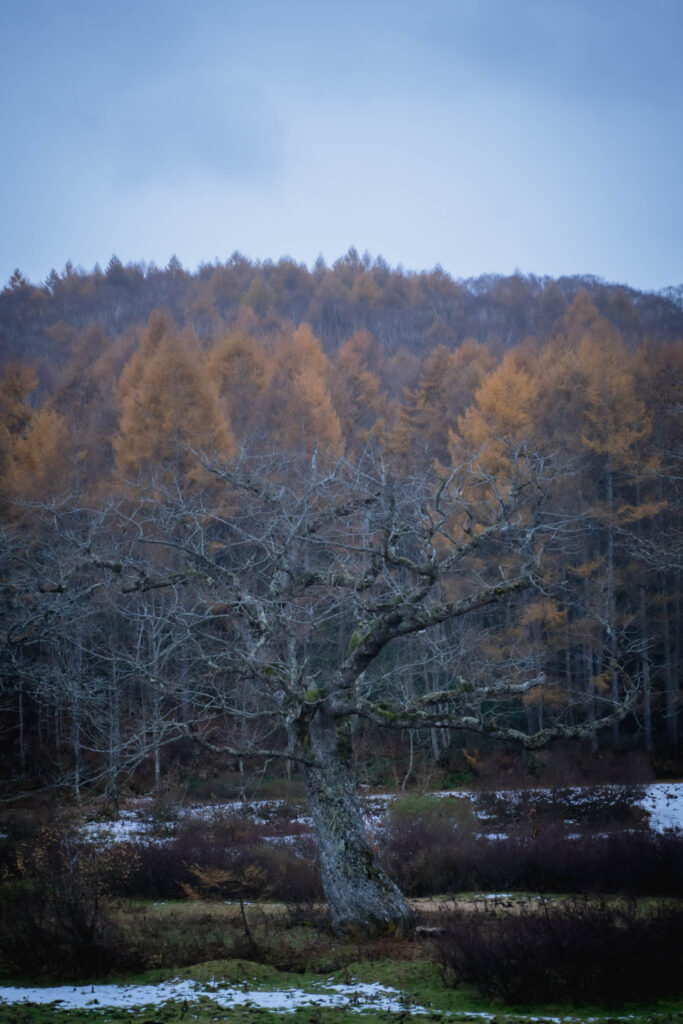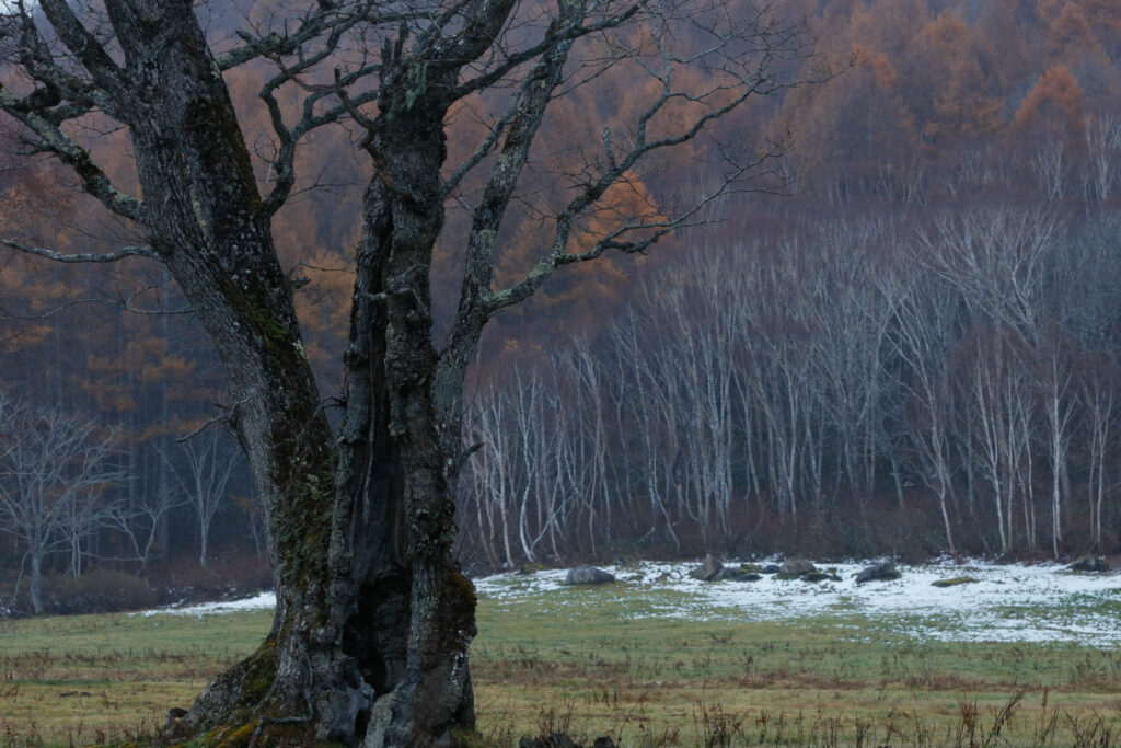 曇りの早朝に浮かび上がる木々を撮りました。 カヤノ平にはその時にしかない季節や光や空気があると思います。
