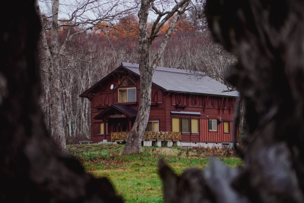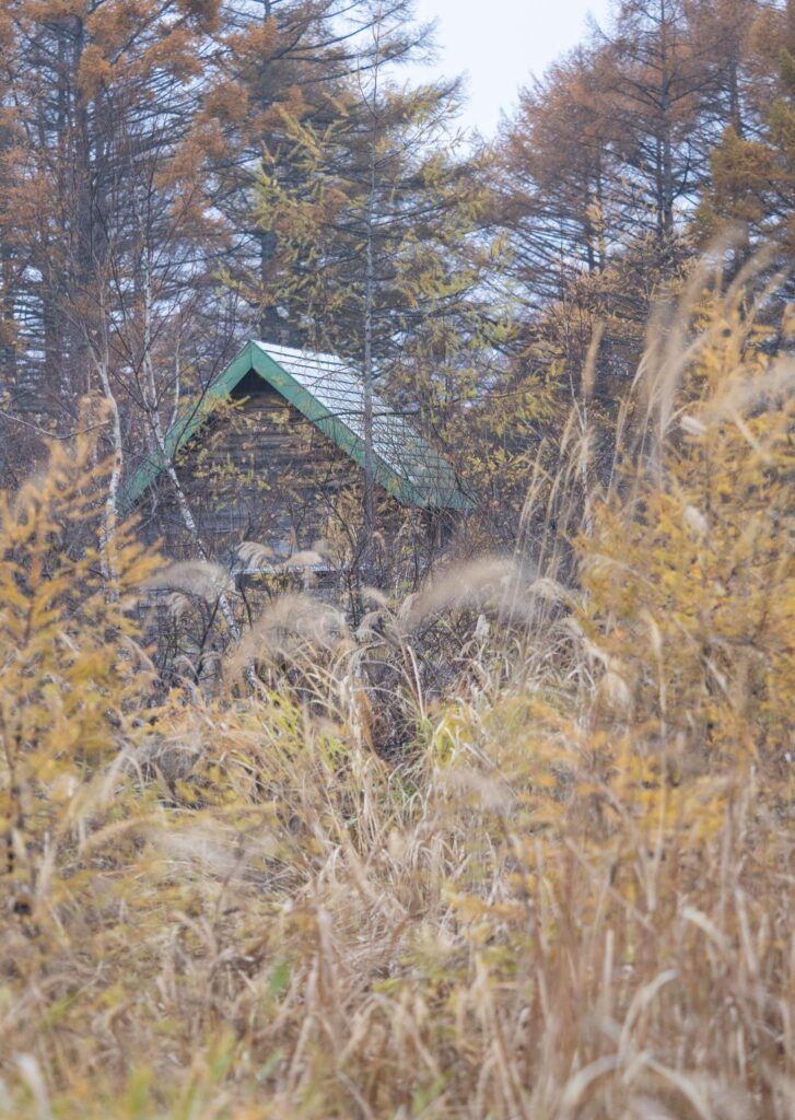 夏のにぎやかさが去り、ポツンと佇む晩秋のロッジを、不思議な穴からのぞいてみました。カヤの平高原は季節によって印象が異なるので面白いです。