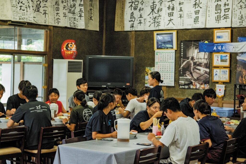 今回の合宿は二泊三日。村内にある『石川荘』を利用しました。スキーブームの時代、50年ほど前にオープンした民宿です。洋室12部屋、和室12部屋、最大収容人数30人が宿泊できる全室冷暖房完備の部屋になっています。食事の提供時間については、合宿のスケジュールの要望に合わせて柔軟に対応していただけるのが、とてもありがたいところ。利用者のなかには夏の合宿を受け入れ始めた30年前から、毎年利用している合宿チームがあるというほど、長く愛されています。